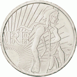 • 10/20/50 Cent: Die Säerin, ein Motiv des früheren Franc. Nach den heraldischen Regeln der Tingierung ist die Farbfolge Blau-Weiß-Rot der Trikolore durch Schraffur dargestellt.