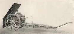 Die Lafette bestand aus einem Rohrschlitten, der Rohrwiege mit Rohrbremse, einer zweiteiligen Unterlafette und einem Federvorholer, welcher das Geschützrohr nach der Schussabgabe wieder in die Ausgangsposition zurück führte. Der Rohrschlitten war fest mit dem Geschützrohr verbunden, konnte aber bei der Zerlegung und dem Transport von diesem gelöst werden. Die Rohrwiege bestand aus Stahlblech und war kastenförmig zusammengenietet. Die Rohrbremse und der Federvorholer waren im Inneren der Rohrwiege verbaut.[2] Die Unterlafette bestand aus der Vorder- und Hinterlafette. Beide Teile waren trogförmig aus einem Stück gegossen. Die Vorderlafette erhielt ein Lager für die abnehmbare Vorderachse. Die Räder daran waren große Holzspeichenräder. Die Hinterlafette wurde mit der Vorderlafette verbunden und verfügte am Ende über einen festen Sporn und ein Lager für den Richtbaum.[3]