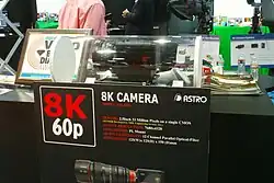 Einige Digitalkameras liefern insbesondere für Stehbilder eine entsprechende Bildauflösung, die auf solchen Bildschirmen wiedergegeben werden kann.[1] Für Videoaufnahmen gibt es seit 2011 8K-taugliche Kameras von Anbietern wie Sony,[4] später wurden weitere Produkte von Herstellern wie zum Beispiel von Astrodesign,[5] Hitachi, Red Digital Cinema Camera Company[6] und Sharp vorgestellt.[7]