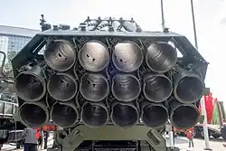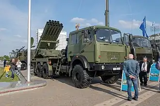 ![]() Raketenwerfer 9P140MB Uragan-M auf Basis eines MAZ-631705 während der Messe MILEX 2019 | |