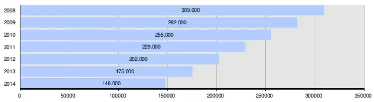 Grafik der Entwicklung der ausstehenden Schulden des Stadtrates zwischen 2008 und 2014 gemäß dem Ministerio de Hacienda y Administraciones Públicas:[8]