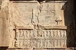 Die Beischriften befinden sich am südlicheren der beiden Felsengräber am Westabhang des Kuh-e Rahmat in Persepolis. Das betreffende Felsengrab wird auch als Grab V als Folge der vier Gräber (Grab I–IV) in Naqsch-e Rostam bezeichnet.[2] Die Beischriften werden mit einer zusätzlichen Zahl referenziert:[3]