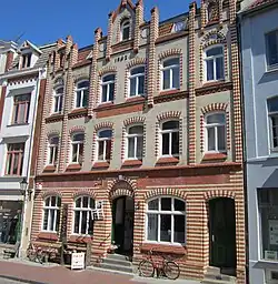 - Nr. 17: 3-gesch. Wohn- und Geschäftshaus Hansa (D) mit verklinkerter und verfliester Fassade, reich dekoriert mit roten und beigen Bändern und Lisenen; Sitz des KaSo Wismar Kunstverein