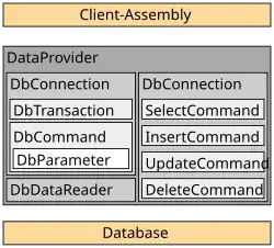 - Connection: Stellt eine Verbindung her, die der Kommunikation mit einer Datenquelle dient. Seit .NET 2.0 ist es möglich, bei der Verbindung umfangreiche Metadaten zur Datenbank zu laden.