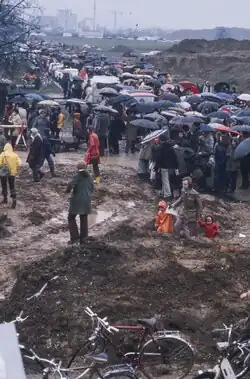 Am ersten April 1975 wurde das Gelände des Kraftwerkes zum zweiten Mal von Aktivisten besetzt, nachdem sie vom Baubeginn erfahren hatten.[10] Die Regierung des Kantons Aargau fasste zunächst keine Beschlüsse zum Eingreifen.[11] Nach einer Woche wollten die Anwesenden Besetzer, die immer noch eine Räumung durch die Polizei erwarteten, das weitere Vorgehen beschliessen und riefen zu einer Solidaritätskundgebung auf, die auch hätte der Abschluss der Besetzung sein können. Stattdessen versammelten sich im Regen am 6. April 15'000 Menschen auf dem Areal und ermutigten die Besetzer in ihrer Vollversammlung in ihrem Entschluss zum Bleiben.[12] Es entstand ein Besetzerdörfli mit täglichen Vollversammlungen.[13]