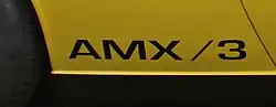 Die Abkürzung AMX steht für American Motors Experimental (sinngemäß: Versuchsmodell der American Motors Company).[20] Seit 1968 verwendete AMC sie für einen in Serie produzierten Sportwagen mit Frontmotor. Das Mittelmotorcoupé erhielt zu Beginn der Entwicklungsphase die Bezeichnung AMX/3; sie war auch als Verkaufsbezeichnung des letztlich nicht verwirklichten Serienmodells vorgesehen. Die 3 – für das dritte Experimentalfahrzeug – wurde typografisch zumeist mit einem Schrägstrich angebunden. Dieser Schriftzug findet sich auf einigen Prototypen. Abweichend davon verwendete AMC allerdings bei mindestens einem Prototyp die Schreibweise AMX III.[21] Eine zeitgenössische Skizze zeigt außerdem ein Fahrzeug mit dem Schriftzug AMX/K, wobei das K für den Karosseriehersteller Karmann steht.[22][23]