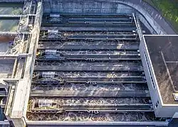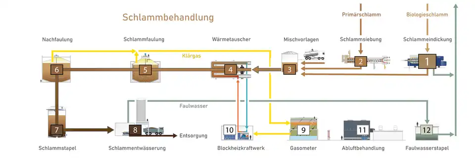 - Mechanische Vorreinigung: Durch den Grobrechen, den Sandfang, den Feinrechen, das Regenüberlaufbecken sowie das Vorklärbecken werden Feststoffen wie Papier, Fäkalien und Sand entfernt.