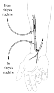 Im Rahmen der nephrologischen Dialysebehandlung wird gewollt eine derartige Verbindung, ein so genannter Shunt (auch: arteriovenöser Bypass[31]), geschaffen, um so einen höheren Blutfluss während der Behandlung zu gewährleisten (siehe nebenstehende Abbildung). Dieser Dialyse-Shunt ist heutzutage die häufigste Form einer AV-Fistel.[4] Man spricht von einer „Venenarterialisierung“ der „Shuntvene“.[32] Hier beträgt der Shunt-Volumenstrom etwa 1 l/min oder im Mittel 15 ml/s[33] und in Einzelfällen bis zu 3 l/min.[34]