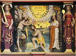 Schalldeckel mit zwei Riesen und dem auferstandenen Christus -