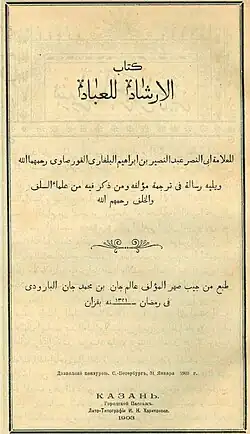 - al-Iršād ilā ma lā-budd minhu li-l-ʿibād[39] („Die Rechtleitung zu dem, was die Gottesdiener brauchen“)[31] oder al-Iršād li-l-ʿibād, gedruckt 1903 in Kasan,[40] ist ein arabisches Werk, das sich an ein breites Publikum richtet und die hanafitischen Methoden zur Hadith-Interpretation sowie die Methoden des Idschtihād zusammenfasst.[41]