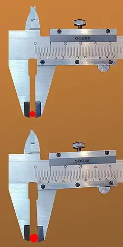 Liegen die am Prüfling zu messende Strecke und der Maßstab (Maßverkörperung) des Messgerätes nicht in einer Linie, können im Messgerät Kippfehler (sogenannte Kippfehler erster Ordnung) auftreten (siehe auch: Messschieber). Diese hängen vom Spiel des Messschiebers quer zur Bewegungsrichtung ab und sind prinzipiell nicht zu vermeiden.