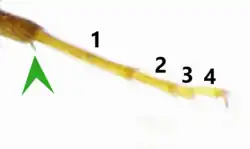 | Abb. 6: links Vordertarsus, rechts Hintertarsus 1,2,... Nummern der Tarsenglieder Pfeilspitzen auf Enddornen der Schienen | |