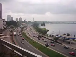 Die Städte Abobo, Adjamé, Attécoubé, Cocody, Plateau und Yopougon liegen auf dem Festland nördlich der Ébrié-Lagune. Daher kommt auch die Bezeichnung «Abidjan Nord». Treichville, Koumassi, Marcory und Port-Bouët sind Teil von Abidjan Süd. Die beiden Teile der Metropole werden zwischen Treichville und Plateau durch zwei Brücken, den Pont Houphouët-Boigny (Eisenbahn und Straße) und den Pont Charles de Gaulle (nur Straße) verbunden. In den Hauptverkehrszeiten kommt es auf den Straßen täglich zu Staus. Der Bau einer dritten, zollpflichtigen Brücke (Pont Henri-Konan-Bédié) zwischen Marcory und Cocody wurde an ein französisch-geführtes Konsortium vergeben[12]. Diese Brücke wurde 2014 eröffnet.[13] Zu einigen Stadtteilen und zu entfernteren Orten an der Ébrié-Lagune bestehen Fähr- und Bootsverbindungen.