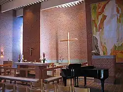 Die Wände des Kirchsaals sind auch von innen in roten Ziegeln gemauert. Der Boden ist mit rotem Granit gefliest. Zur Apsis hin befindet sich eine Stufe, auf dieser Erhöhung befindet sich das Taufbecken und die Kanzel, beide sind ebenfalls gemauert. Der Altar befand sich ehemals in der halbrunden Apsis an der Ostseite des Kirchenschiffs, wurde allerdings weiter zur Gemeinde hin gerückt. Der Altar besteht aus zwei gemauerten Säulen mit einer massiven grauen Granitplatte. Ein Altarbild ist nicht vorhanden, sondern ein schlichtes Holzkreuz in der Apsis. Die Bänke sowie die Stühle des Kirchsaals sind aus hellem Eichenholz.