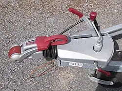 Das Abreißseil wird mit Schlaufe und Karabinerhaken um den Hals der Kugelkopfkupplung des Zugfahrzeugs gelegt. Sollte sich der Anhänger unerwartet während der Fahrt vom Zugfahrzeug lösen, wird der Handbremshebel durch die Zugwirkung des Abreißseils betätigt und die Feststellbremse angezogen.[1][2] Das Abreißseil inklusive Karabiner, Öse am Fahrzeug, Ring muss dafür die 7500-Newton-Norm der DIN 5299 erfüllen. Die Feststellbremse muss darauf „auch bei einer Steigung von 18 Prozent und in einem Gefälle von 18 Prozent“ den Anhänger selbsttätig zum Stehen bringen.[3] Dies verhindert, dass der Anhänger nach dem unerwarteten Lösen ungebremst weiterrollt,[4] wie es bei einer groben Fehlfunktion oder Fehlbedienung der Kupplung nicht mit Absolutheit ausgeschlossen werden kann. Während ältere Kugelkopfkupplungen, die nach der Richtlinie EG 94/20[5] geprüft wurden, häufig keine zusätzlichen Bohrungen oder Ösen zur Aufnahme des Abreißseils haben, ist nach der neuen Norm ECE 55 R[6] seit 17. März 2010 eine derartige Sicherung vorgeschrieben. Die Führung des Seiles durch eine solche Öse soll verhindern, dass die Schlaufe über die Kugelkopfkupplung rutschen kann. Lässt sich der Haken nicht durch die Öse führen, kann z. B. ein entsprechend dimensionierter Schäkel Abhilfe bringen. Eine Nachrüstung wird in Deutschland nicht verlangt, ist jedoch in den Niederlanden und der Schweiz Pflicht.