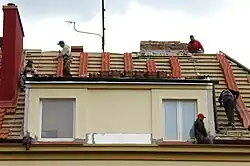 - Im Bereich der Arbeitssicherheit werden Maßnahmen zur Absturzsicherung wie Gerüste, Bau-Geländer, Auffangnetze, Seilsicherungen[1] oder Abdeckungen verwendet. In Bereichen, in denen aus strukturellen und räumlichen Bedingungen eine Absturzgefahr besteht, wie beispielsweise auf Flachdächern oder an Fassaden, können Anschlagpunkte für Kontrolle und Unterhalt eingeplant werden.
