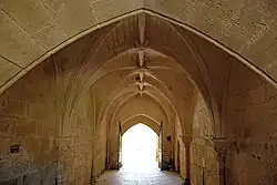 Sie war der erste Kirchenraum des zunächst romanischen Klosters, entsprechend den benediktinischen Regeln ausgestattet mit einfachem Tonnengewölbe ohne Strukturen (einschiffig, ohne Querschiff) und ohne Dekor. An den rohen Steinwänden sind rundum rote Tatzenkreuze des Templerordens eingemeißelt, ein Ausdruck der Dankbarkeit gegenüber den wohlhabenden Ordensrittern für die Leihgabe von Geldmitteln und für den Schutz, den sie den Santiago–Pilgern gewährten.