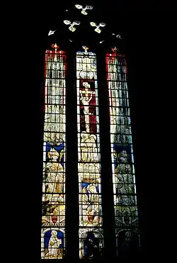 Die Chorfenster wurden zwischen 1425 und 1437 geschaffen. Sie wurden von Jacques de Mauvoisin in Auftrag gegeben und jede Lanzette trägt sein Wappen. Die Scheiben im Maßwerk stammen aus dem 20. Jahrhundert.[5] Auf dem mittleren Fenster ist die Kreuzigung Christi dargestellt, darunter die Verkündigungsszene. Die mittlere untere Scheibe ist dem Abt Jacques de Mauvoisin gewidmet.[6]