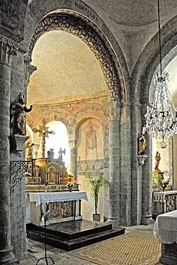 Der etwas nach Norden achsenversetzte Chor ist wahrscheinlich um das 17. Jahrhundert aus altem Baumaterial wiedererrichtet worden. Dabei sind durchaus Abweichungen von der ursprünglichen Ausführung nicht ausgeschlossen. Der Chor besteht aus einem ganz kurzen rechteckigen „Joch“ mit Tonnenwölbung und der halbrunden Apsis mit Halbkuppelkalotte. Die Chorwände gliedern sich in eine Arkatur aus einer mittleren und größeren und je zwei kleinere Arkaden zu beiden Seiten. Die äußeren sind geschlossene Blendarkaden, die inneren drei enthalten je ein rundbogiges Fenster mit aufgeweiteten Gewänden. Die Arkadenbögen stehen auf Rundsäulen mit schlichten Blattkapitellen und kaum vortretenden Kämpferplatten.