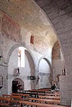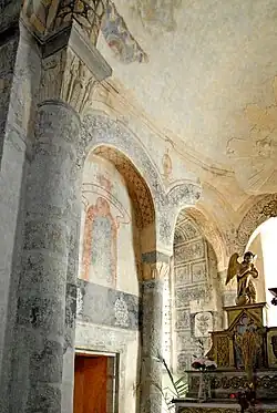 Die angespitzte Tonne des Mittelschiffs stammt wahrscheinlich erst vom Beginn des 14. Jahrhunderts, zu dem auch die Vergrößerung des Fassadenfensters mit angespitztem Bogen datiert wird. Der Zeitpunkt des Seitenschiffanbaus ist wegen seiner rohen nicht einheitlichen Architektur schwer zu bestimmen.[1] Das noch rundbogige Kreuzgratgewölbe im Joch 1 und die Fenster mit Rundbögen deuten noch auf die späte Romanik, hingegen die spitzbogigen Kreuzrippengewölbe in den Jochen 2 und 3 auf die frühe Gotik. Die Reste der ältesten Fresken im 3. Joch des Seitenschiffs werden auf das 11. Jahrhundert datiert. Das wiederum lässt annehmen, dass das Seitenschiff noch im selben Jahrhundert erbaut worden ist, vielleicht mit Kreuzgratgewölben in allen Jochen.