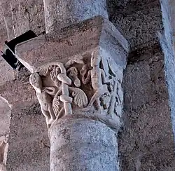 Die Kapitelle der Bündelpfeiler der Vierung zeigen teilweise bemerkenswerte Skulpturen. Ein Kapitell widmet sich der sog. Geschichte vom Sündenfall im Paradies. Adam und Eva stehen beiderseits des Baums der Erkenntnis, um den sich die Schlange windet. Von ihr erhält Eva die verbotene Frucht, die sie in der rechten Hand hält. Ein weiteres Kapitell präsentiert eine mythische Szene. Zwei geflügelte Pferde halten mit Menschenhänden eine Schlange mit zwei Beinen. Zwischen den Pferden bäumen sich zwei Hunde auf. Ein Kapitell zeigt an den Ecken je einen Vogel, der etwas im Schnabel hält, entweder einen Pelikan, der ein Stück seiner Brust herausgerissen hat, ein Symbol für Tod und Auferstehung, oder einen Adler mit Beute im Schnabel, ein Symbol für Christus, der Seelen zum Himmel emporhebt[4], oder für den Teufel, der Seelen raubt, wie es bei manchen Kirchenvätern geschrieben steht[5]; das Pelikanmotiv wird ausführlich im Physiologus erklärt. Zwei Kapitelle zeigen Masken über Blatt- und Rankenwerk. Aus dem Mund eines Gesichts wachsen Ranken, ein anders trägt eine Krone und wird von zwei Speeren flankiert. Darüber hinaus gibt es etliche schlichte Blattkapitelle.