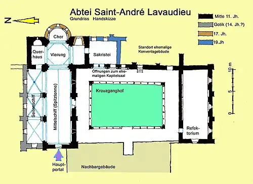 Die Erbauung des Kreuzgangs und der Konventsgebäude, wie Kapitelsaal, Dormitorium, Refektorium, Wärmeraum, Küche, Vorratsräume und andere, muss zwischen 1052 und 1058 stattgefunden haben. Ob die zugehörige Kirche diejenige war, die zur Stiftung des Radulf von Lugeac gehörte, oder ob sie zusammen mit den Konventsgebäuden oder sogar noch etwas später neu errichtet wurde, ist nicht belegt. Sie besaß nur ein Schiff aus drei Jochen, wahrscheinlich mit einer Tonnenwölbung, ein Querschiff aus einer Vierung und zwei Querhausarmen, deren Wölbungen eine Trompenkuppel und zwei Tonnen waren, und einen halbkreisförmigen Chor mit Halbkuppelkalotte. Die Arbeiten wurden von „casadéennes“, den Mönchen der Abtei la Chaise-Dieu ausgeführt, oder standen zumindest unter ihrer Aufsicht.