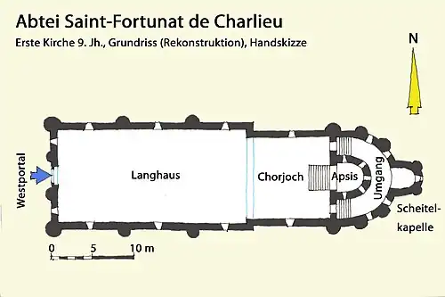Das einschiffige Langhaus der Kirche stand auf einem rechteckigen stützenfreien Grundriss, der durch äußere halbrunde Wandvorlagen in drei Joche unterteilt war, zwischen denen kleine rundbogige Fenster ausgespart waren. Die Fassade (Westwand) war durch ebensolche Pfeiler in drei Abschnitte unterteilt mit einem schlichten rundbogigen Hauptportal, das in den Seitenfeldern von zwei Fenstern flankiert wurde. Im Osten folgte ein etwas schmaleres, nahezu quadratisches Chorjoch, mit je einem Fenster in den Seitenwänden. Dieses wurde östlich von einem Umgangschor abgeschlossen, dessen im Grundriss halbkreisförmige Außenwand an die Seitenwände des Chorjochs anschloss. An deren Scheitel trat eine kleine Apsidiole (kleine Apsis) hinaus. Die Wände des Umgangs und der Scheitelapsidiole wurden von sieben halbrunden Wandvorlagen unterteilt, zwischen denen fünf rundbogige Fenster ausgespart waren. Der Umgang umschloss eine halbrunde Chorapsis, in deren Wand fünf kleine Fenster eingelassen waren. Chorjoch und Umgangschor wurden durch eine Wand voneinander getrennt, in der eine zentrale rundbogige Arkadenöffnung ausgespart war, die von zwei kleineren rundbogigen Durchlässen flankiert wurden. Der Boden der Chorapsis und des Umgangs lag neun und sieben Stufen höher als das Chorjoch. Die großen Spannweiten von Schiff und Chorjoch ließen damals keine Steinwölbungen zu, sondern waren vermutlich von hölzernen Dachstühlen überdeckt. Der Chorumgang wurde vielleicht von einer durchgehenden gebogenen Tonne überwölbt, die Apsiden von halben Kuppelkalotten.