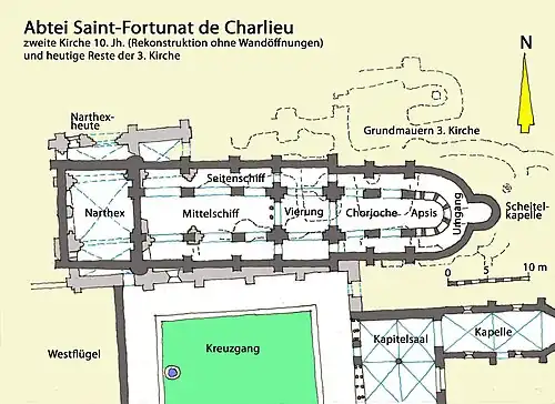 Die dritte Kirche von Charlieu entstand unter den Nachfolgern Abt Odilo (994–1049) und Abt Hugo (1049–1109), ein umfangreicherer Neubau, der 1094 durch Papst Urban II. geweiht werden konnte. Im Jahr 1130 wurde an die Westfassade des Neubaus ein offener zweigeschossiger Narthex angebaut, dessen Eingang sich geländebedingt nach Norden öffnete. Der Grundriss der dritten Kirche Saint-Fortunat ist direkt vergleichbar mit der nur etwa 25 Kilometer entfernten Prioratskirche der Ste-Trinité d’Anzy-le-Duc aus dem 11. Jahrhundert, was eine gemeinsame Planung nahelegt. Die dreischiffige Anlage mit vortretendem Querhaus und fünfteiligem Staffelchor ist ebenso von ihrer Mutterkirche in Autun übernommen worden, die sich an dem Vorbild der 1088 zerstörten Abteikirche Cluny II orientierte.