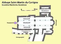 Von den vorgenannten Beobachtungen ausgehend wird für die Kirche Saint-Martin du Canigou folgende Chronologie vorgeschlagen.[6] Der Ostteil beider Geschosse bestand schon bei der ersten Weihe im Jahr 1009. Danach ruhte die Bautätigkeit, belegt wird dies anhand der provisorischen Fassade, deren Existenz man in der Krypta feststellen kann. Die Unterbrechung war allerdings von kurzer Dauer und vor dem Jahr 1014, spätestens jedoch 1026, wurde die westliche Hälfte hinzugefügt. Aus ästhetischen Gründen und weil keine zwingende Notwendigkeit bestand, verzichtete man in der Oberkirche auf die technischen Neuerungen, die man in der Krypta ausprobiert hatte: Die Tonnengewölbe wurden über Säulen nach Osten und Westen einfach weitergespannt. Nach dem Bau der Kirche fügte man an deren Südflanke im Osten eine schmale Kapelle hinzu, in der die Reliquien des heiligen Gaudérique verehrt wurden. Ihr Chor bildet eine vierte Apsis, die mit den übrigen Apsiden fluchten. Ihr Mauerwerk ist schmucklos.