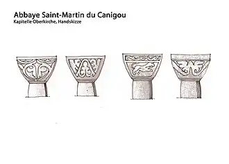 Die Steinmetze der Oberkirche bedienten sich zunächst des derben und ungeschliffenen Stils der Krypta.[7] So sieht man beispielsweise auf einem Kapitell im östlichen Abschnitt der Oberkirche eine sehr einfache gemeißelte Gestalt mit riesigem Kopf und kleinem Körper, die sich in einem unübersichtlichen Liniengewirr verliert. Sehr bald tauchten aber zwei Schmuckelemente auf, die sich im Verlauf der Bauphase durchsetzten. Es handelt sich um die Kreuzblume und die Palmette, wobei letztere nichts anderes ist als die Kombination von zwei Kreuzblumen. Beide Schmuckelemente, die dem Erbe der alten Mittelmeerkulturen entstammen wurden während des 11. Jahrhunderts sowohl im christlichen Westen, als auch in den islamischen Ländern so häufig verwendet, dass man nicht sagen kann, auf welchem Wege sie nach Saint-Martin du Canigou gelangt sind.
