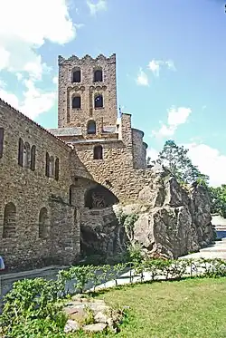 Der oberste Abschnitt des Turms lässt jegliche Mauerdekoration vermissen, wird aber allseitig ohne Zäsur von je drei ganzen und zwei halben Zinnen bekrönt, die in etwa 45 Grad Neigung zugespitzt, deren seitliche Schrägen Schicht für Schicht abgetreppt sind. Die fehlende Dekoration deutet darauf hin, dass das oberste Stockwerk nach dem Erdbeben von 1428 unter Verzicht dieser Ausschmückungen wieder aufgebaut worden ist. Betrachtet man heute die Proportionen des Turms, erscheint es durchaus möglich, dass der Turm ursprünglich höher war. Vielleicht besaß er, ähnlich dem Turm von Cuxa, ein zusätzliches Stockwerk mit Zwillingsöffnungen und einige Okuli darüber. Auch wie dieser besaß vermutlich der Turm ursprünglich keinen Zinnenkranz, der erst später hinzugefügt wurde.