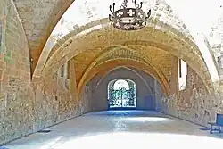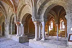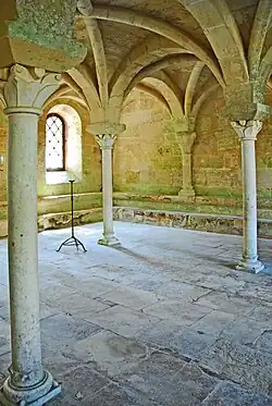 Der Saal besitzt einen fast quadratischen Grundriss und wird allseitig von steinernen zweistufigen Sitzbänken umschlossen. Er wird von schlanken Säulen in neun fast quadratische Felder unterteilt, die ein Netz von Kreuzrippengewölben tragen. Vier längere freistehende Säulen begrenzen das mittlere Feld. Zehn kürzere dreiviertelrunde Säulen stehen auf den oberen Sitzstufen an die Wände angelehnt. Ihre Schäfte sind glatt und werden vom Kapitell durch einen schmalen Ring getrennt. Ihre Kapitelle sind großblättrig skulptiert und werden von kräftigen, schlicht profilierten und weit ausladenden Kämpfern abgedeckt. Die runden attischen Basen stehen auf kantigen Plinthen mit Eckspornen. Die Gurtbögen der Gewölbe besitzen einfache rechteckige Querschnitte, die der Schildbögen an den Wänden sind halb so breit. Die diagonalen Kreuzrippen haben fast gänzlich runde Querschnitte.