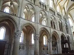 Der innere Aufbau besteht aus vier Stufen: Hauptarkaden, Emporen, Triforium und Obergaden (Fensterzone), darüber ein sechsteiliges Rippengewölbe. Vom Portal ist nur das Tympanon erhalten, das die Dreifaltigkeit, das Marienleben und das Martyrium des hl. Viktor darstellt.