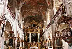Die heutige barocke Kirchenanlage stellt eine dreischiffige Hallenkirche über fünfjochigem Grundriss dar, die allseitig von Emporen umschlossen wird: Auf der westlichen Eingangsseite spannt sich die Westempore zwischen den beiden Turmbauten, auf der Ostseite ist die Empore als Psallierchor der Mönche hinter dem Hochaltar durchgeführt. Die ungewöhnliche Raumform ohne Ausgrenzung eines eigentlichen Chorbaus wird noch dadurch artikuliert, dass dem Kirchenbau auf allen vier Seiten mittig jeweils ein zweigeschossiger Kapellenanbau über dreiviertelkreisförmigem Grundriss angefügt ist. Die in zwei Geschossen angelegten Fenster sind von Renaissance-Rahmen aus ungewöhnlich schlanken Säulen und Sprenggiebeln mit Obeliskenaufsätzen eingefasst, deren Vorbilder eher in der zeitgenössischen Profan- denn in der Sakralbaukunst zu suchen sind. Die Wölbung des Kirchenraums erfolgt durch ein ungegliedertes Kreuzgratgewölbe im Mittelschiff, Kreuzgratgewölben in den Seitenschiffen und Stichkappentonnen in den Emporen.