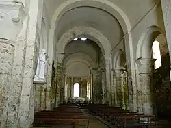 Über abwärtsführende Treppenstufen gelangt man in das dreischiffige Kircheninnere; dieses ist geprägt von massiven Pfeilern mit vorgelegten Halbsäulen und riesigen Kapitellblöcken, deren obere Ecken leicht eingerollt sind. Ein Tonnengewölbe mit Gurtbogenunterzügen schließt das Mittelschiff nach oben ab. Das Untergeschoss eines – im 16./17. Jahrhundert weitgehend neu erbauten – Laternenturms über der Vierung belichtet den darunterliegenden Raum durch zwei kleine Rundfenster (oculi) in der Kuppel. Die beiden seitlichen Querhausarme haben einfache Tonnengewölbe. Die Gestaltung der Apsis mit ihren drei großen Fenstern, die jeweils von zwei Säulen gerahmt werden, ist dagegen deutlich feinteiliger; unterhalb der Apsiskalotte verläuft ein Konsolenfries. Auch die groben Formen des Kircheninneren machen eine frühe Datierung wahrscheinlich.
