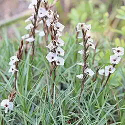 In den Achseln der Frühlingsblätter an der Basis diesjähriger Zweige stehen auf Blütenstandsschäften die einfachen oder verzweigten ährigen Blütenstände.[2][1] Wenn die Blütenstände verzweigt sind, dann setzen sie sich aus ährigen Teilblütenständen, die zweireihig angeordnet sind und jeweils ein bis fünf Blüten enthalten, zusammen. Die Tragblätter sind deutlich kürzer als die Deckblätter der untersten Blüten und ihre Ränder sind häutig. Das unterste Deckblatt ist dem Tragblatt ähnlich und sein Rand ist breit häutig.[2]