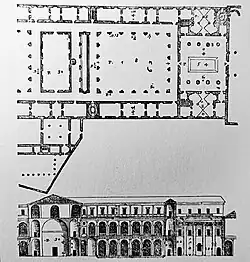 Am 7. März 1561 wurde Palladio das erste Mal in den Dokumenten des Baus erwähnt, für welches er ein Modell anfertigte. Die Entwurfsarbeiten begannen wahrscheinlich bereits 1560. Durch finanzielle Schwierigkeiten des Konvents konnte der Entwurf nur fragmentarisch ausgeführt werden. Ein verheerender Brand von 1630 zerstörte den Palladio-Bau bis auf wenige Reste (ein Flügel des Kreuzgangs, Sakristei, Treppenanlage), die nach den folgenden Um- und Aufbauten erhalten geblieben sind. Palladios Quattro Libri zeigen den gesamten Entwurf als Grund- und Aufriss. Nach seinen eigenen Angaben im Traktat wollte er ein römisches Haus der Antike nachbauen. Der Grundriss zeigt ein Peristyl mit umlaufenden Arkaden, der von symmetrisch angelegten Räumen flankiert wird. Der Aufriss und die heute erhaltene Fassade des Peristyls bestehen aus drei Etagen, die hierarchisch angeordnet sind: ein dorisches Erdgeschoss, ein ionisches piano nobile und ein mit korinthischen Pilastern gegliedertes Obergeschoss. Während das Obergeschoss rechteckige Fenster hat, bestehen die anderen beiden Geschosse aus Pfeilerarkaden, denen Halbsäulen vorgeblendet sind (Theater-/Tabulariumsmotiv). Damit orientiert sich der Palladio-Bau stärker an den römischen Theatern der Antike als an den Wohnhäusern.[2]