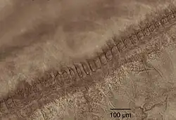 An ihrer Bildung sind die Schrillader, die Schrillleiste mit Lamellen oder Schrillzähnen und die Schrillkante beteiligt, an der Verstärkung die Harfe und der Spiegel. Die Schrillader zieht von der Flügelbasis zunächst nach hinten, biegt alsbald in einem scharfen Bogen um und verläuft zum Innenrand des Flügels. Dort befindet sich in unmittelbarer Nähe die verdickte Schrillkante. Der mit Schrillzähnen besetzte Teil der Schrillader ist die Schrillleiste. In diesem Abschnitt sind auf der Unterseite die Schrillzähne angeordnet. Sie bestehen aus einem kräftigen Mittelstück mit zwei seitlichen spitzen Fortsätzen. Die Anzahl der Schrillzähne auf einer Schrillleiste beträgt im Mittel etwa 215 (bei beobachteten Variationen von 193 bis 260).[1]