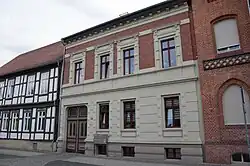 Das Haus wurde im 19. Jahrhundert aus Ziegelmauerwerk errichtet und besitzt eine Stuckfassade. Es steht an einem mittelalterlichen Bauensemble, das 1805 weitestgehend bis auf die Grundmauern abgetragen wurde. Erhalten sind von dem mittelalterlichen Bauensemble noch der große Teil einer Mauer mit einem Spitzbogenportal, ein Keller sowie zahlreiche Formsteine und Balken, die eine zweite Verwendung erfuhren. Diese Überreste sind baugeschichtlich nicht völlig geklärt.[1]
