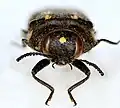 | Abb. 2: Ausschnitt Brustschild weißer Pfeil: Auge roter Pfeil: Fleck und Haare gelb blauer Pfeil: mittleres Grübchen grüner Pfeil: äußeres Grübchen pinker Pfeil: Zähnung am Rand in Abb. 2,3: links entspricht vorn |