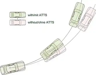 Durchfährt ein frontgetriebenes Fahrzeug mit hoher Geschwindigkeit eine Kurve, so neigt das Fahrzeug zum Untersteuern. Das bedeutet, das Fahrzeug fährt einen weiteren Bogen als gewünscht. ATTS greift hier vorbeugend ein, indem es die Antriebskraft auf die angetriebenen Räder variabel verteilt und das stark belastete, kurvenäußere Rad stärker antreibt als das kurveninnere Rad. Das kurvenäußere Rad unterstützt die Kurvenfahrt aktiv und zieht den Wagen zusätzlich.