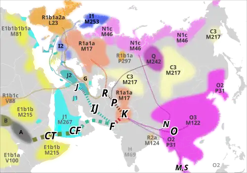 Übersicht der möglichen Entwicklung von Y-DNA-Haplogruppen beginnend vom Zweig CT. Dargestellt sind auch die dominierenden Haplogruppen im euroasiatischen und nordostafrikanischen Raum.