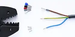 Zunächst erfolgt das Abisolieren auf die richtige Länge ohne Beschädigung der Litzen oder der verbleibenden Isolierung, gefolgt vom Aufschieben der passenden Aderendhülse und dem Verpressen.[1] Dabei wird die Aderendhülse passend zum Leiterquerschnitt mit einer Aderendhülsenzange oder maschinell (teilautomatisiert) verarbeitet. Aderendhülsen-Presswerkzeuge bzw. -zangen erzeugen ein V-förmiges (Dorn-Pressung), viereckiges (Quadrat, Rechteck, Trapez) oder sechseckiges Profil. Der Vorgang wird auch mit dem englischen Begriff Crimpen bezeichnet. Die Anforderungen an Crimpverbindungen sind in der EN 60352-2:2014-04 festgelegt. Neben der Vermeidung typischer Fehler, wie sie beim Crimpen entstehen können (s. u.), ist die erreichte Zugfestigkeit der Hülse ein Testkriterium. Zur Qualitätssicherung werden auch Schliffbilder angefertigt.