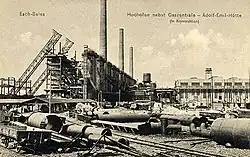 Die Adolf-Emil-Hütte erstreckt sich nordwestlich von Esch-sur-Alzette auf einem ursprünglich etwa 200 Hektar großen Gelände.[4] Die Anlage des Werks folgt streng dem Produktionsablauf. Von Westen her folgen aufeinander die Erzbunker, die in einer Reihe angeordneten Hochöfen, das Stahlwerk und die ausgedehnten Walzwerksanlagen. Ein weitläufiges Schienennetz umgibt und erschließt das Werk. Für die Technische Werksleitung wurde südlich des Walzwerks ein repräsentativer Verwaltungsbau mit vorgelagerten Sozial- und Laborgebäuden errichtet. Die eigentliche Zentralverwaltung für alle drei Hüttenwerke entstand dagegen an der „Brasseur-Schmelz“ oder „Aachener Hütte“: Verwaltungsbau, Kasino (heute Musik-Konservatorium) und Angestelltenwohnhäuser. Vor dem Haupteingang des Werks an der Ostseite entstanden Doppelvillen für leitende Ingenieure, außerdem zwei Arbeitersiedlungen im Stile der Gartenvorstadt in Esch-sur-Alzette. Wohl mit Ausnahme der Technischen Werksleitung wurden alle genannten Bauten von dem deutschen Architekten Paul Tafel entworfen, außerdem das Betriebsbüro der Hochöfen, heute Sitz der Entwicklungsagentur „Agora“.[5] Auch für die benachbarte Hütte von Audun-le-Tiche schuf Tafel Werks- und Sozialbauten.