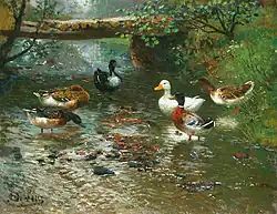 - Lieder ohne Worte, sechs Bauernkinder ziehen Hand in Hand, zwei Gänse vor sich hertreibend, mit Gesang durch's Dorf; ausgestellt: Internationale Jubiläums-Kunstausstellung im Künstlerhaus, Wien 1888 (Ausst.-Katalog, Nr. 1146; mit Abb.); Holzstich nach Gemälde, in: Deutscher Hausschatz, Bd. 15b, 1888/89, S. 521.