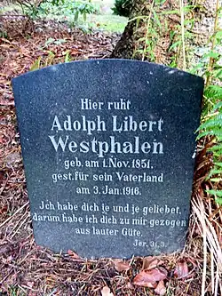 Im Ersten Weltkrieg wurde Westphalen im Alter von 63 Jahren als Major der Reserve eingezogen und als Bataillonskommandeur eingesetzt. Er wurde aber bereits im Jahr 1915 in Serbien schwer verwundet und kam in ein Lazarett nach Zeithain in Sachsen. Hier starb Westphalen am 3. Januar 1916 an den Folgen der Kriegsverwundung und wurde am 7. Januar 1916 im Familiengrab auf dem Friedhof Ohlsdorf in Hamburg im Planquadrat AA 9 südwestlich vom Nordteich begraben.[1][2]