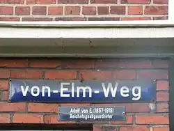 - In Hamburg-Horn wurde am 16. Juli 1929 (erneute Namensgebung am 25. Oktober 1945) der Von-Elm-Weg, am 25. Oktober 1945 die Straße Elmtwiete, und außerdem der Von-Elm-Stieg[8] nach ihm benannt. Der Von-Elm-Stieg wurde im Oktober 2024 in Angelika-Landwehr-Stieg umbenannt. Die Elmtwiete gibt es seit 2020 wieder, sie ist eine Wohnstraße in den „Washington-Höfen“ der SAGA. Die 1940 gebauten Häuser wurden abgerissen und darauf ein neues Wohnquartier errichtet. Im Oktober 2024 wurde der Von-Elm-Stieg umbenannt. Seit dem 10. Oktober 2024 trägt er den Namen Angelika-Landwehr-Stieg. Benannt nach der Gründerin des ortsansässigen Theaters „Das Zimmer“ (ehemals: Theater in der Washingtonallee)