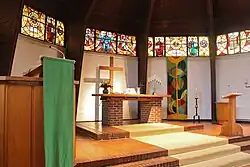 Die 1952 eingebauten farbigen Glasfenster wurden von Claus Wallner[3] als eine seiner ersten Arbeiten gestaltet. Sie stellen Christus auf dem Regenbogen zwischen Engeln und den vier Evangelisten dar. In den Jahren 1953/1954 wurde die Kirche an der Südseite um die bereits von Beginn an geplante Sakristei erweitert.