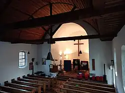 Das Innere besticht durch seine Schlichtheit. Ein durch Tragebalken gestütztes Holztonnengewölbe gibt dem sonst farblosen Raum seine Wärme. Der als Apsis anschließende erhöhte Altarraum beherbergt ein schlichtes Holzkreuz an der Chorwand. Darunter befindet sich an der Wand ein breiter Holzaltar. Links am Übergang von Schiff zu Apsis steht eine hölzerne Kanzel, rechts in der Apsis das Lesepult, am ursprünglichen Platz des Taufsteines, der nun vor der ersten Stufe zur Apsis mittig steht. Die Besonderheit des Taufsteins ist der Werkstoff Holz, sodass in der Gemeinde oft auch vom „Taufstamm“ die Rede ist.