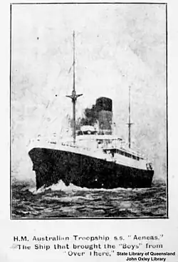 Nach Ausbruch des Ersten Weltkriegs 1914 wurde die Aeneas mit der Kennung A60 von der australischen Regierung als Truppentransporter eingesetzt. Am 5. Oktober 1915 legte sie mit der 10. Division in Ägypten nach Thessaloniki ab. Zwei Tage später kollidierte sie in einem schweren Sturm mit einem Minenabwehrfahrzeug. Am 10. Oktober traf sie nach einem Zwischenstopp auf Moudros in Thessaloniki ein. Im Mai 1918 lief sie bei Torcor Head an der Insel Rathlin auf Grund. Nach Kriegsende wurde sie der Reederei zurückgegeben und kehrte am 29. Mai 1920 mit Platz für 180 Passagiere der Ersten Klasse in den Australiendienst zurück. Ab 1924 wurde das Schiff in einem Joint Venture in Zusammenarbeit mit der White Star Line eingesetzt. Im darauffolgenden Jahre wurde sie auf die Fernost-Route gelegt und stieß zu den Schiffen der Sarpedon-Klasse.